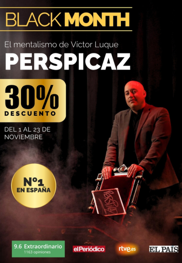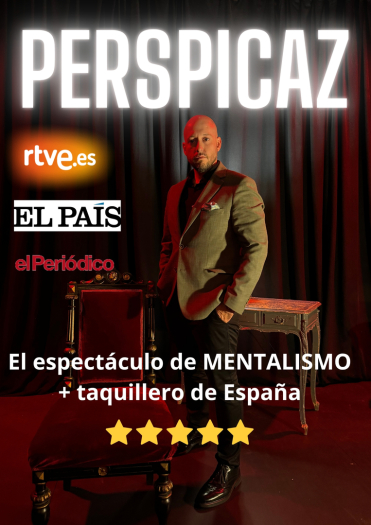Mentalismo en estado puro de Víctor Luque (bautizado así por «el rey del mentalismo» Anthony Blake) La experiencia emocionante e inolvidable del momento, Perspicaz te llevará a los límites de lo que creías posible. El espectáculo mejor valorado de Mentalismo de toda España con un 9,9. + de 45.000 ESPECTADORES! Más taquillero del país!